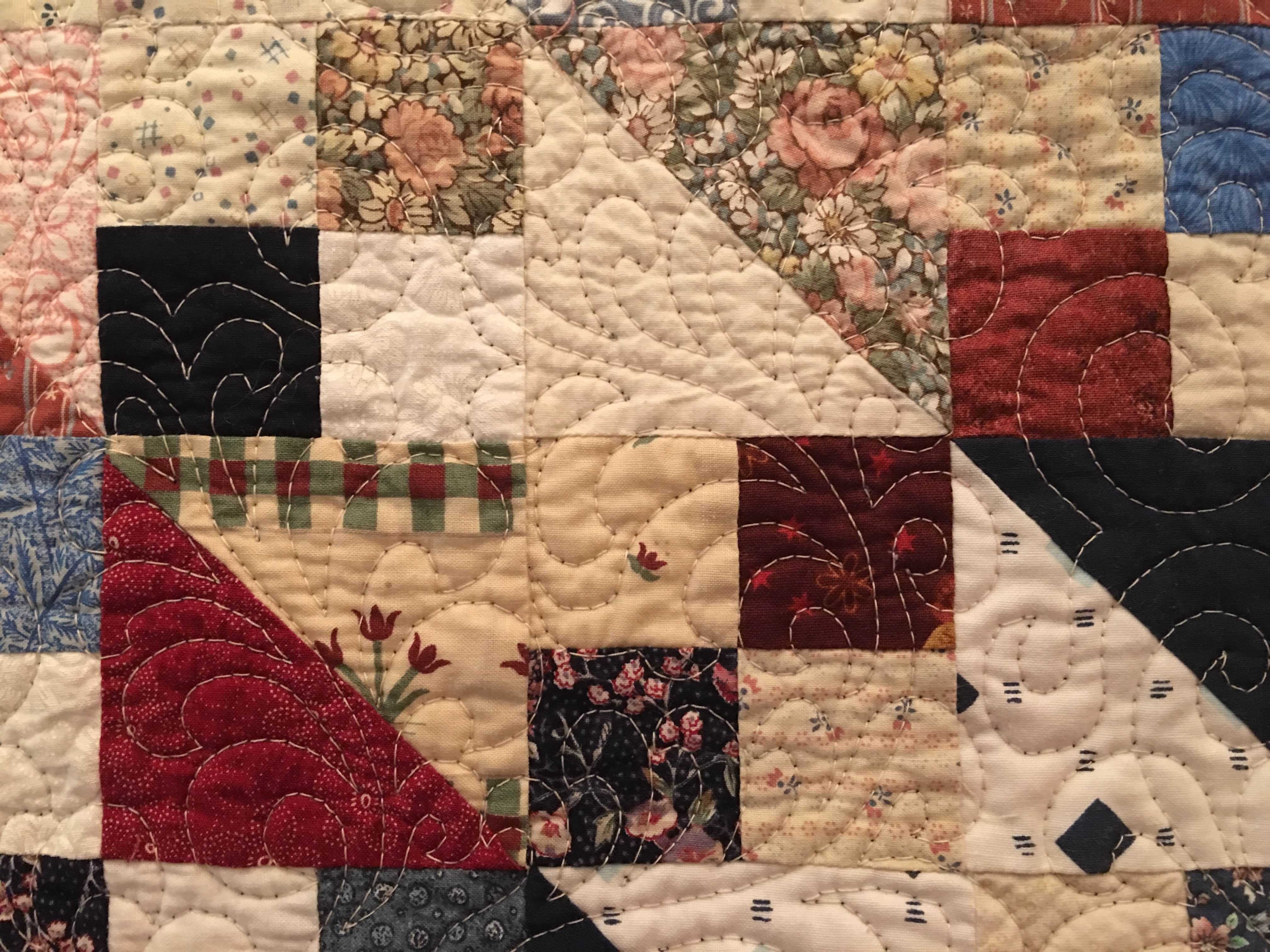 These examples show free-motion, ruler work, and computerized quilting.